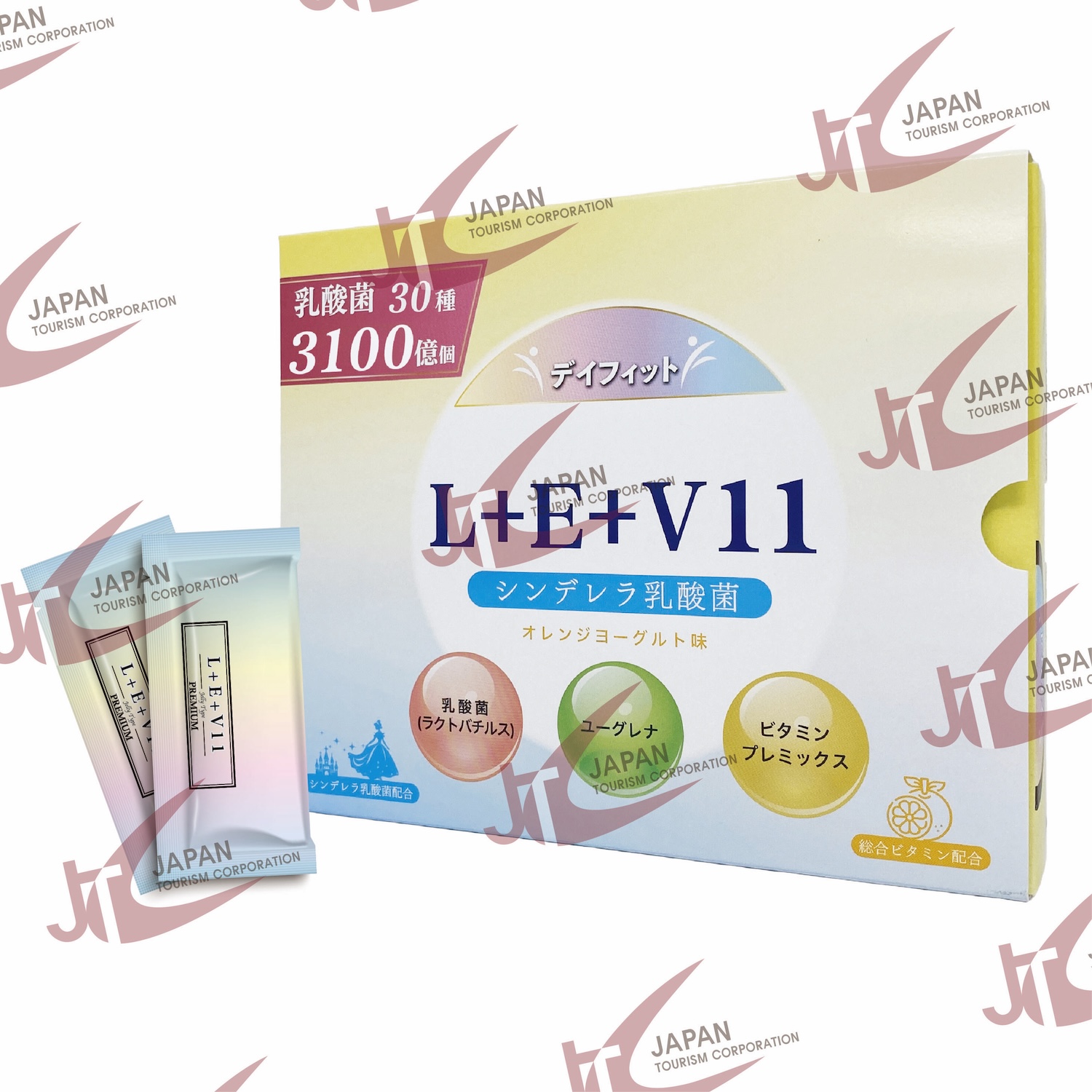 オレンジ果汁(国内製造)、砂糖、発酵乳、果糖ぶどう糖液糖、イソマルトオリゴ糖液糖、乳酸菌(殺菌)、デキストリン、寒天、ユーグレナ、植物性乳酸菌(殺菌)、乳酸菌混合末、乳糖、乳酸菌凍結乾燥末/香料、酸味料、ゲル化剤(增粘多糖類)、pH調整剤、クチナシ色素、安定剤(大豆多糖類)、甘味料(スクラロース、ステビア)、ビタミンC、ビタミンBa、ビタミンB6、ビタミンBハナイアシン、ビタミンE、カラメル色素、パントテン酸カルシウム、ビタミンA、葉酸、ビタミンD、ビタミンB12、(一部に乳成分・大豆・オレンジを含む)