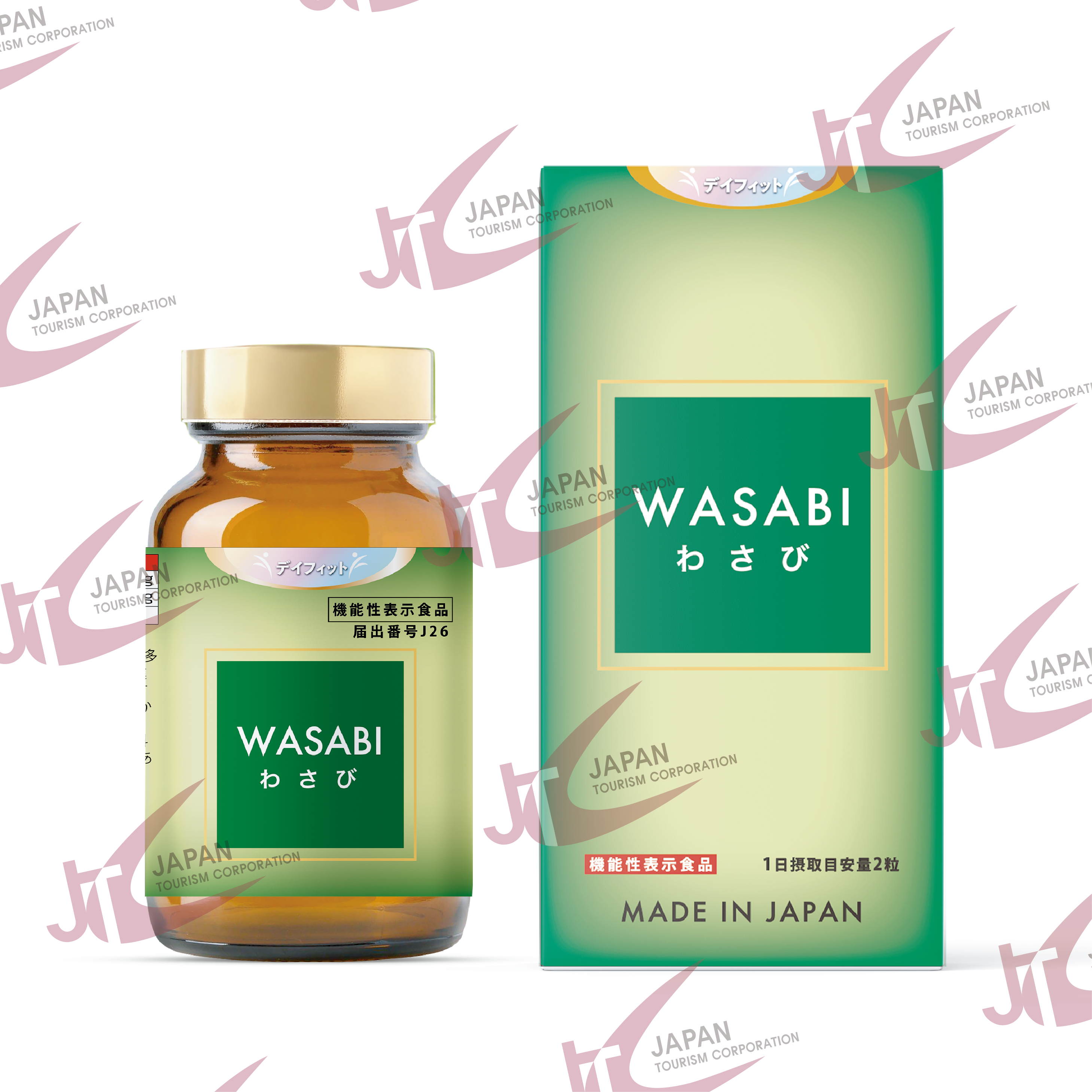 でん粉(国内製造)、本わさびエキス末(国内製造)/セルロース、ゼラチン、環状オリゴ糖、ステアリン酸カルシウム、二酸化ケイ素、着色料(二酸化チタン)