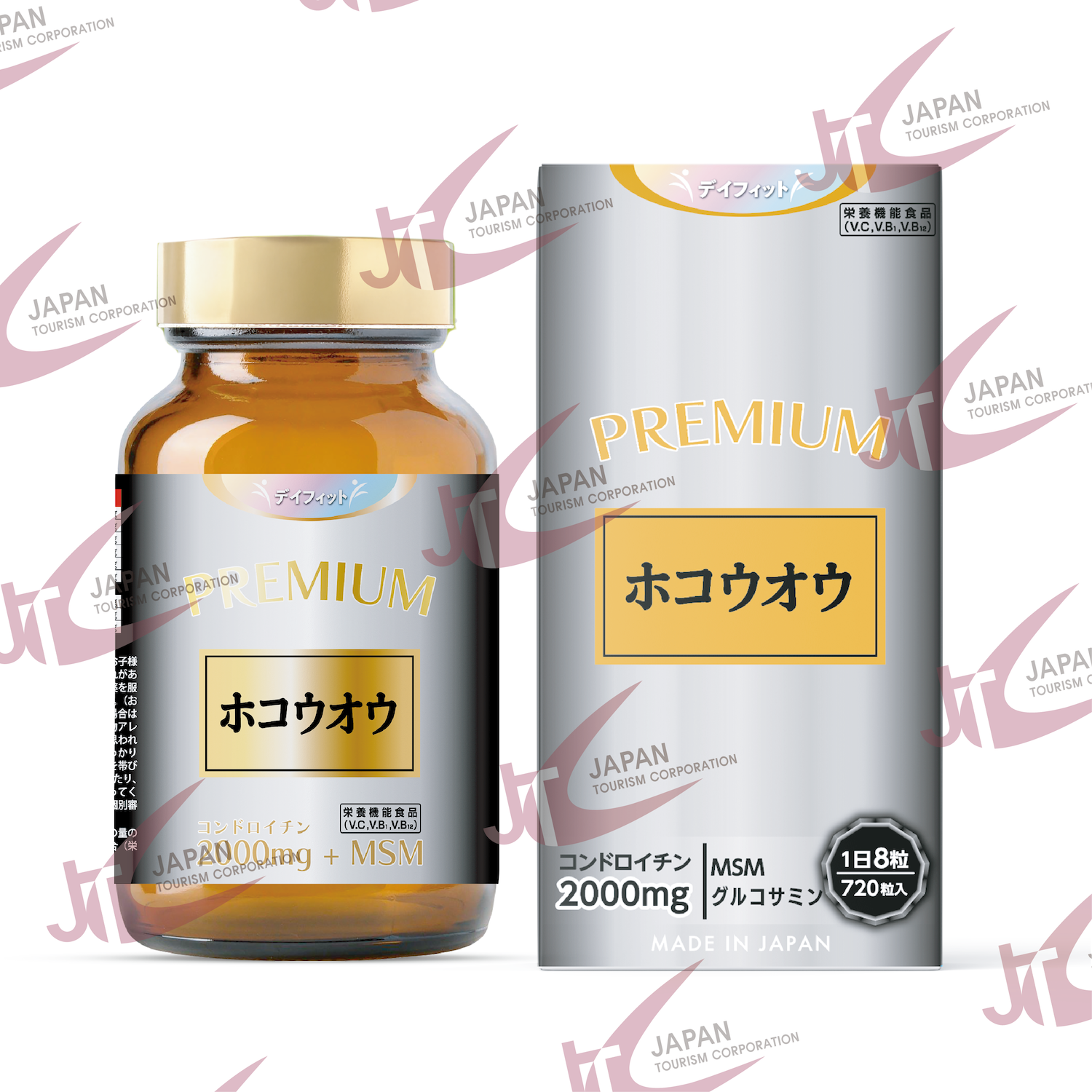 MSM、デキストリン、鮫軟骨抽出物、酵母(マンガン含有)、鶏軟骨抽出物/セルロース、グルコサミン(エビ・カニ由来)、 ショ糖脂肪酸エステル、V.C、微粒酸化ケイ素、ナイアシン、パントテン酸Ca、ヒアルロン酸、V.B₁₂、V.B₆、V.B₂、V.B₁