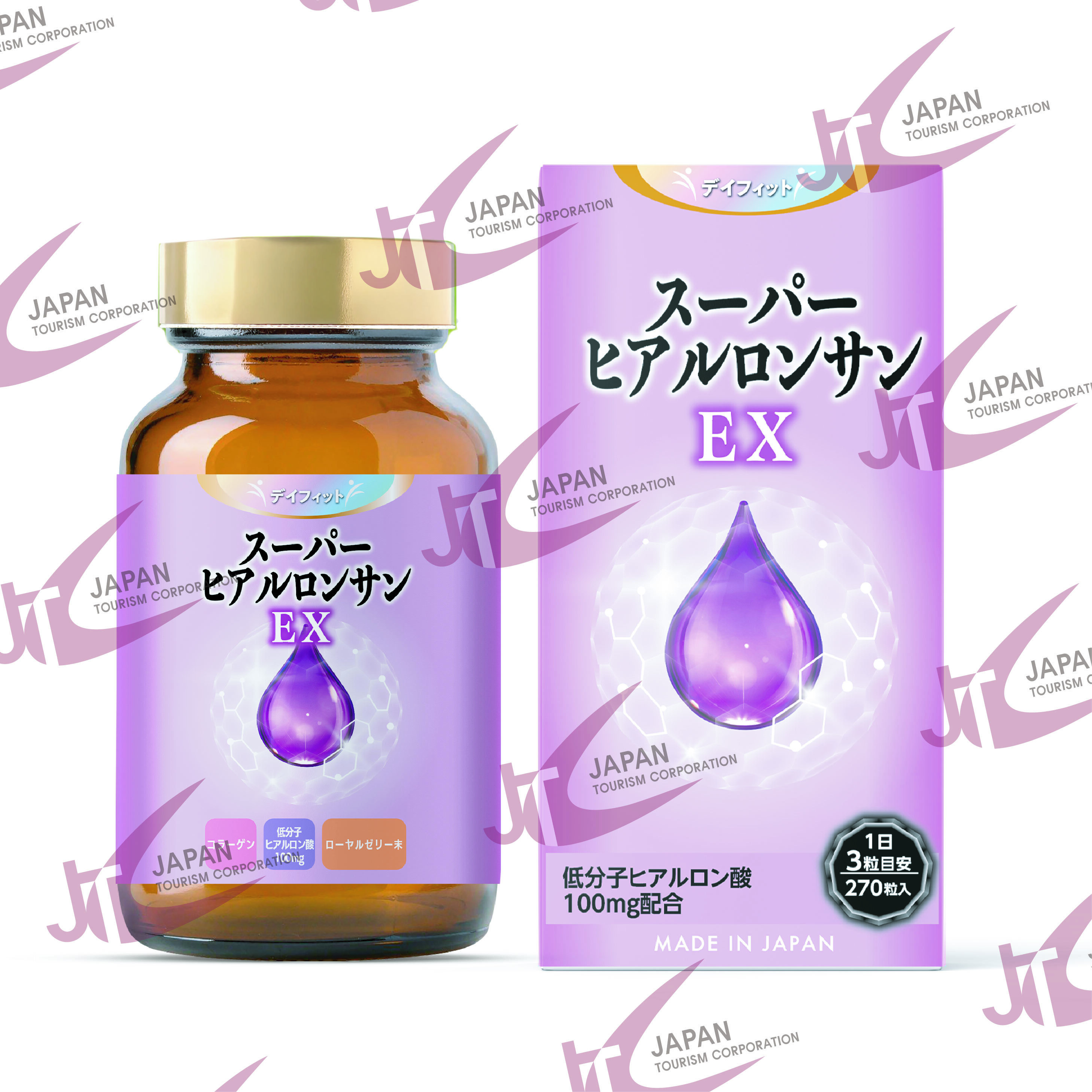 コラーゲンペプチド(ゼラチンを含む)(国内製造)、ヒアルロン酸、ローヤルゼリー、シルク加水分解物(シルク加水分解物、デキストリン)、プロテオグリカン含有サケ鼻軟骨抽出物(デキストリン、サケ鼻軟骨抽出物)/結晶セルロース、ショ糖脂肪酸エステル、二酸化ケイ素